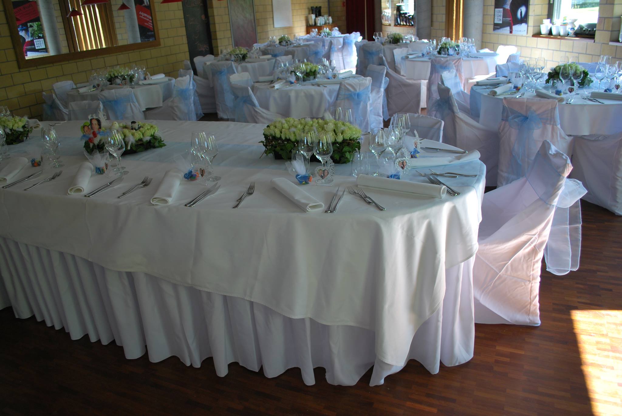 Nous mettons à votre disposition: Des housses de chaises blanches, Selon vos désirs un ruban et un chemin de table à la couleur de votre choix pour rappeler le thème de votre soirée, des nappes blanches, tour pour la table d’honneur.